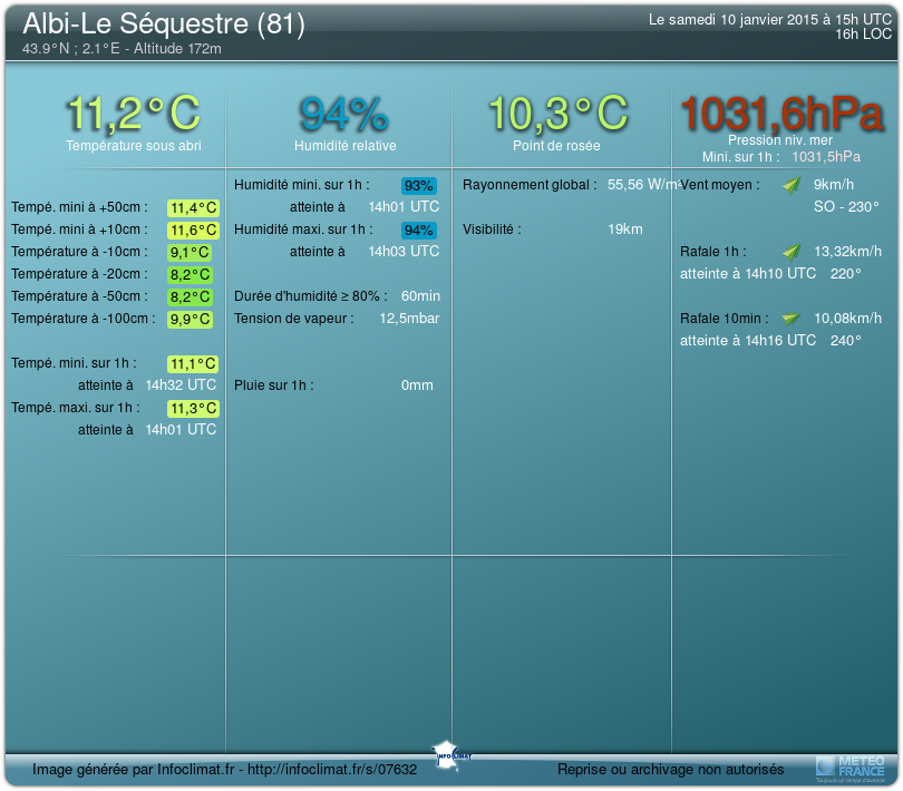 | ![]() | 0.2 mm/1h | 9 km/h raf.13.3 | 99% | 97 | 10.2 °C | 1035.1hPa![]() | 4.7 km |