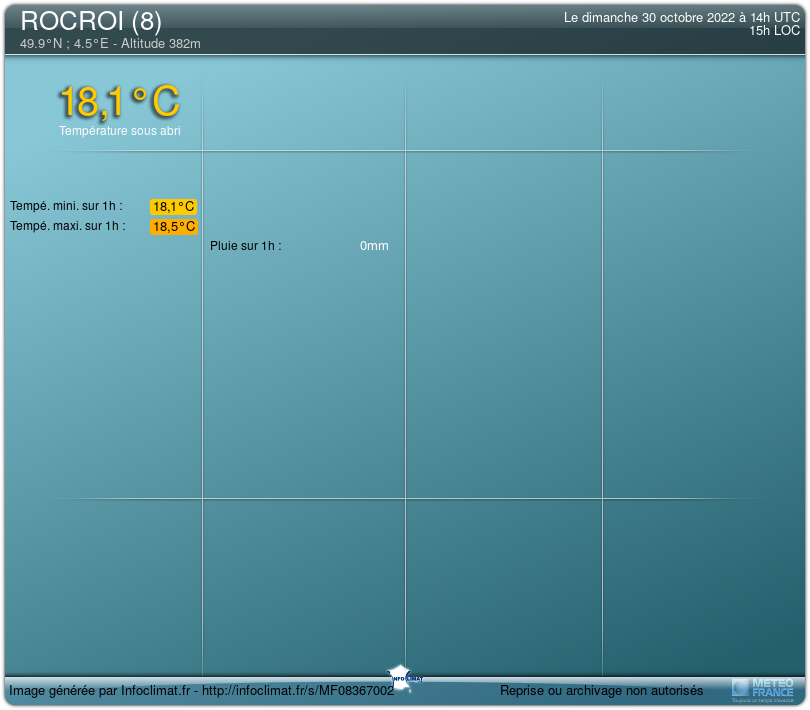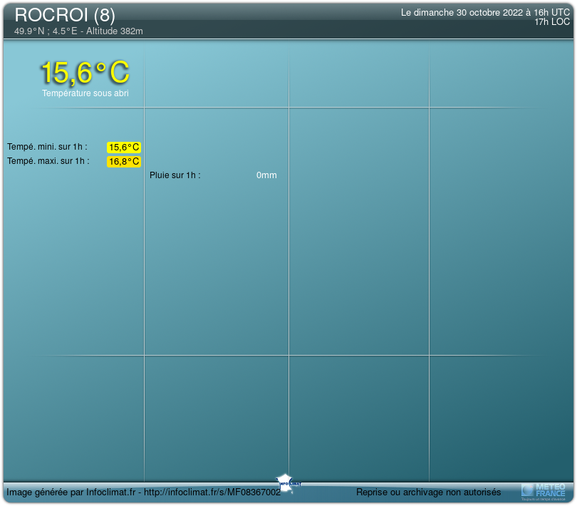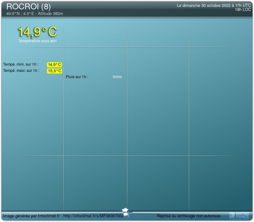 Heure locale | Tempé | Pluie | Vent | Humidité | Pt. de rosée | |